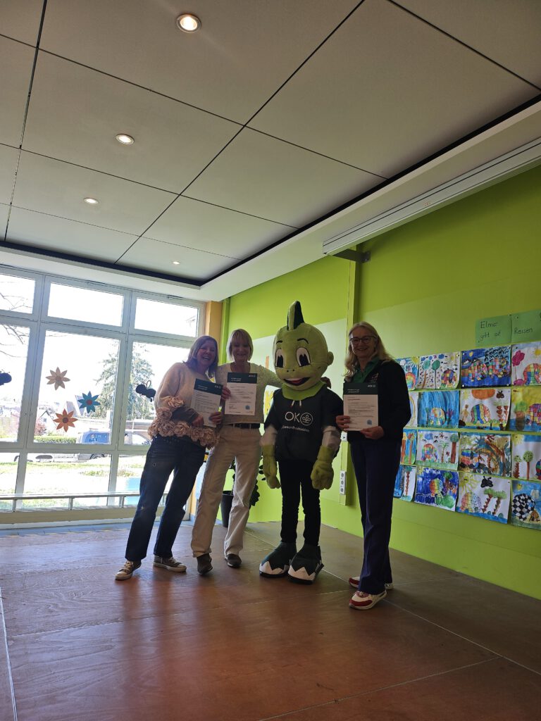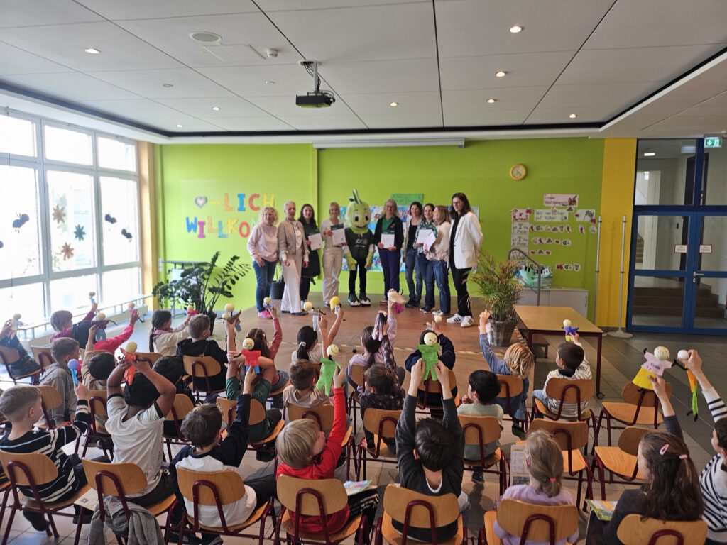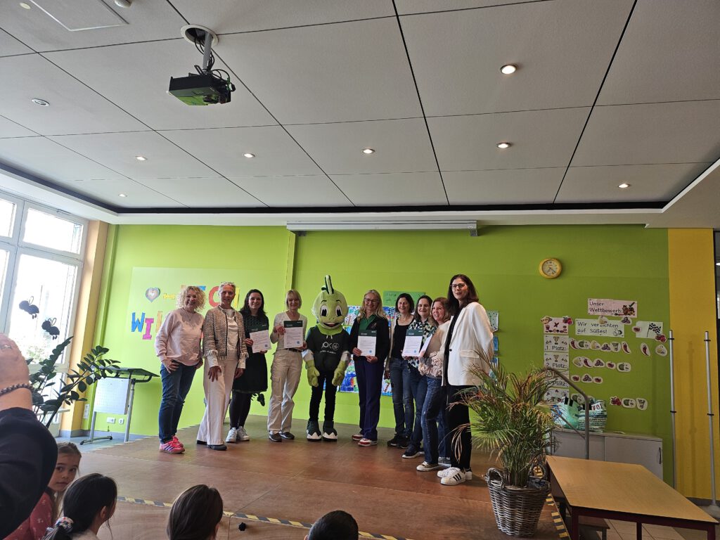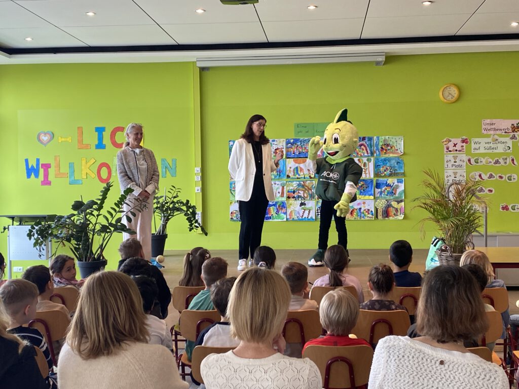 Am Donnerstag, den 16.04.2026 wurden die Urkunden für die Teilnahme am Projekt Klasse 2000 an der Grundschule Herzogenaurach von der AOK Bayern, vertreten durch Frau Litz und Frau Platt sowie dem Maskottchen Jolinchen, ausgegeben.
